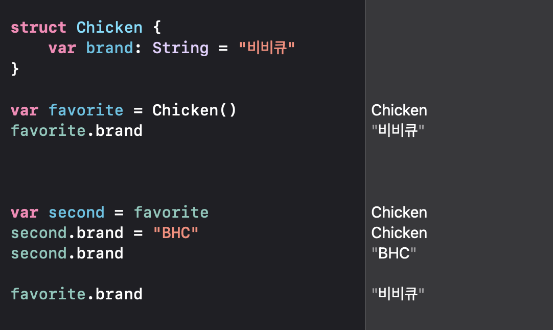구조체는 클래스와 반대로 참조가 아닌, 값의 복사입니다!