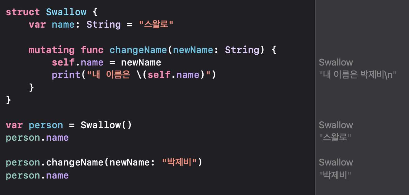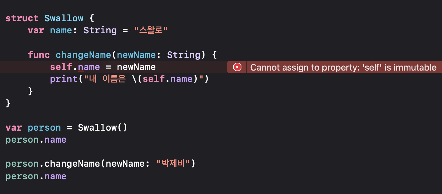 2. 값 타입에서는 원칙적으로 인스턴스 메서드 내부에서 속성 수정이 불가능합니다! 🔥