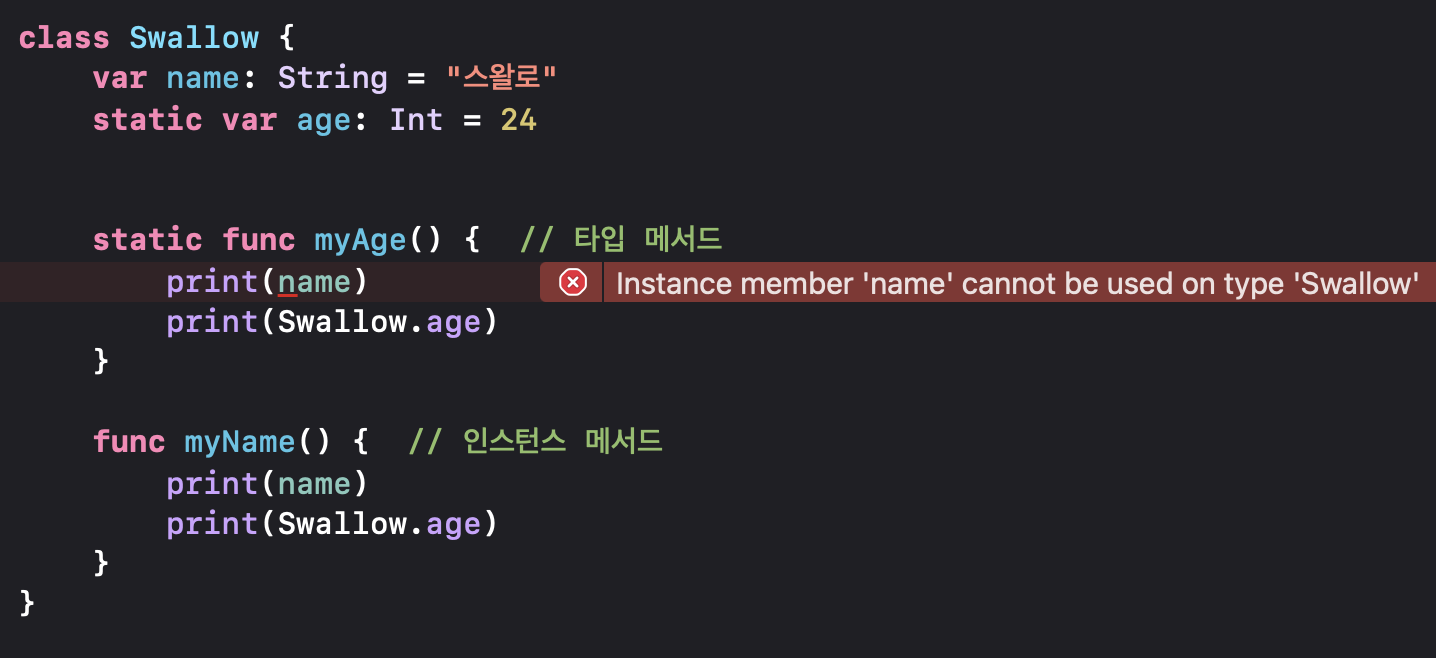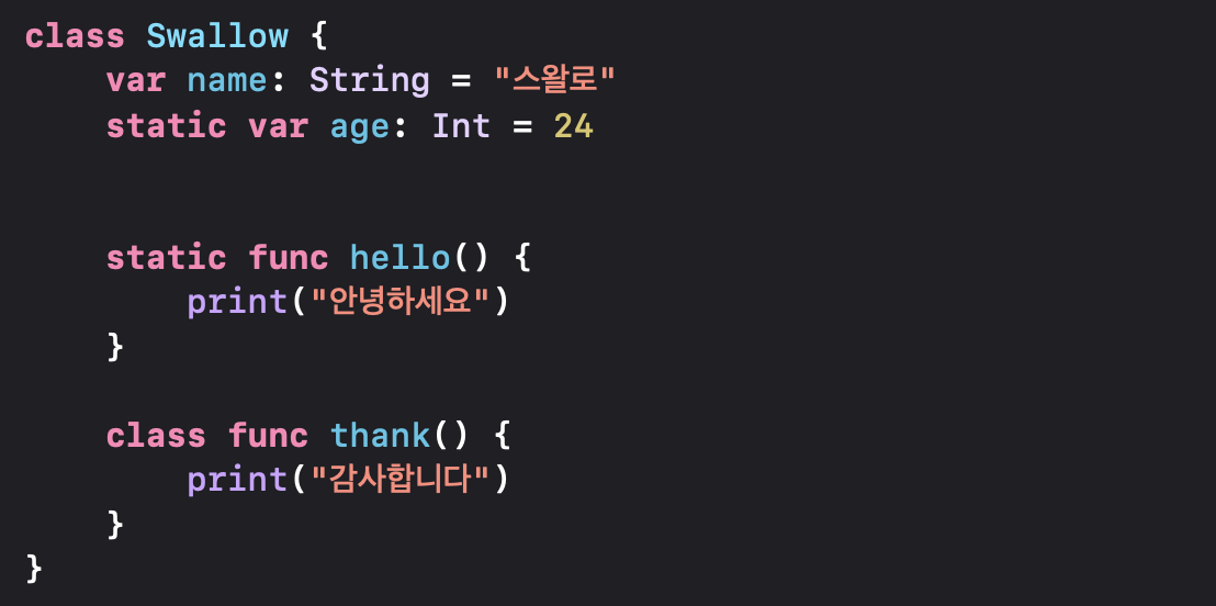 2. 타입 메서드 선언 방법은 static키워드와 class키워드를 func앞에 붙여주면 됩니다! 🔥