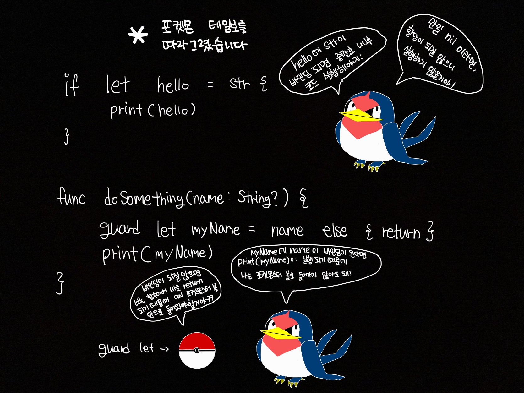 guard문을 사용해서 바인딩이 되는 경우 옵셔널을 벗겨내는 방법입니다!