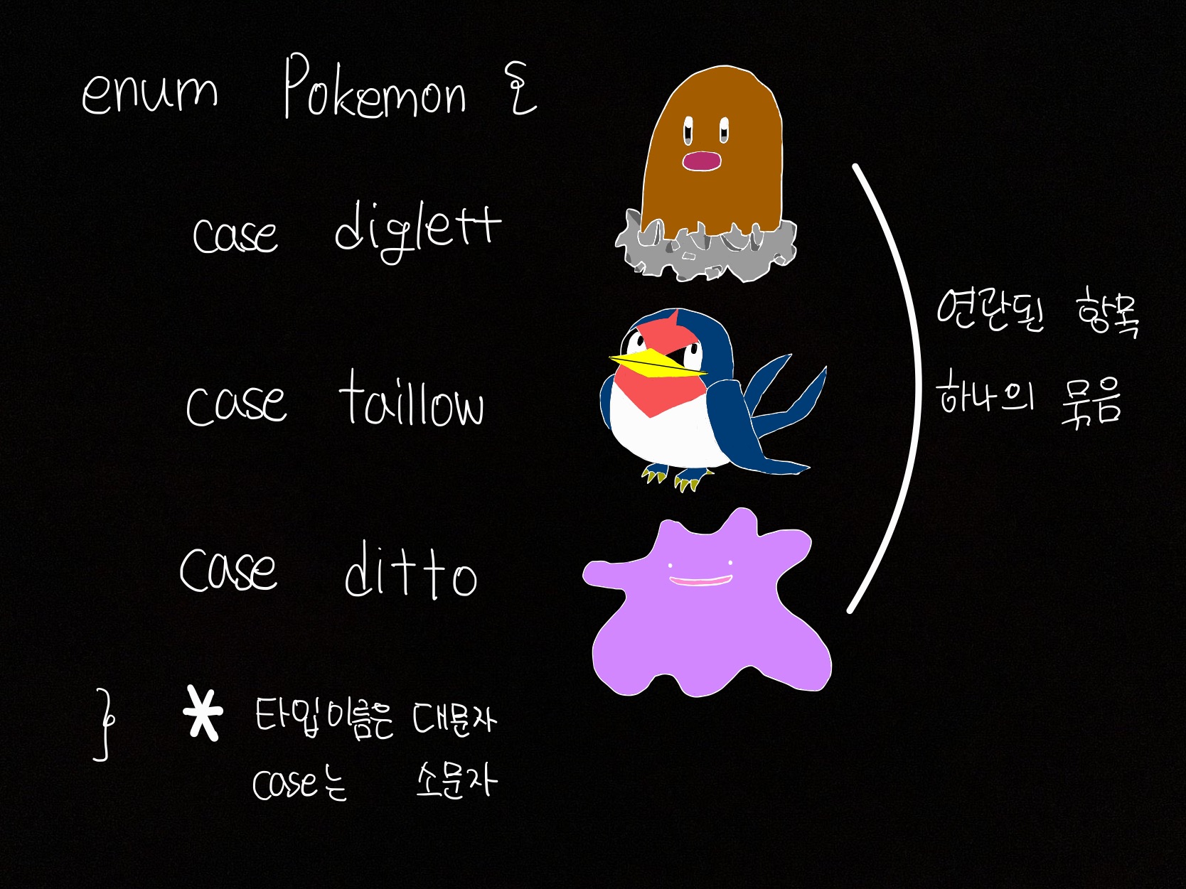 그래서 열거형을 구현을 하실 때는 타입이므로 꼭 대문자를 사용해주세요!